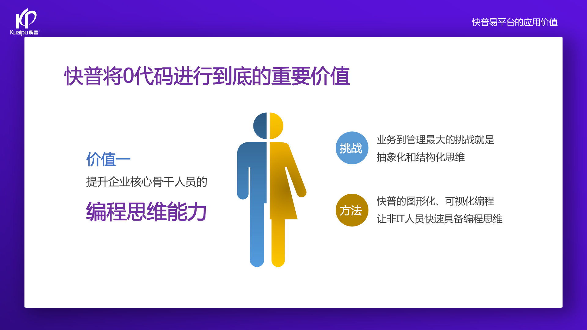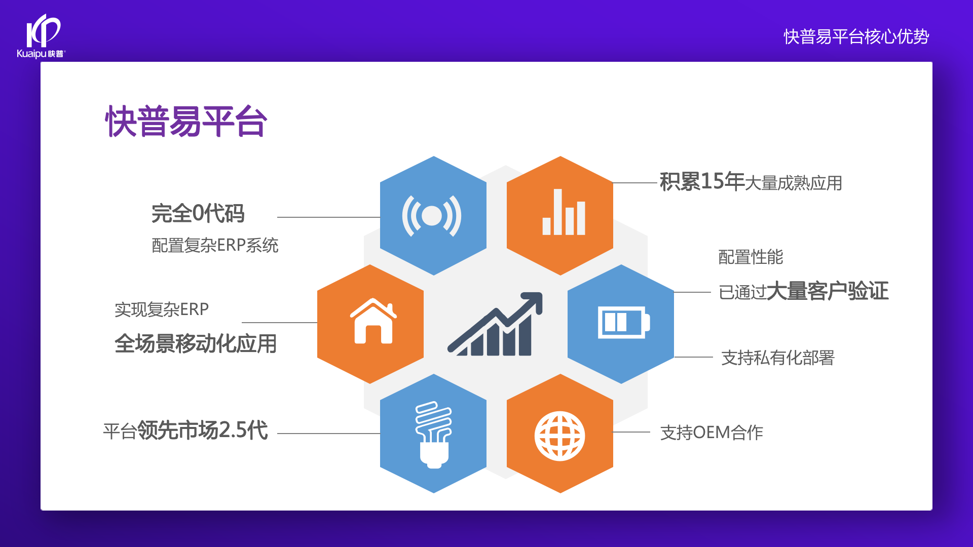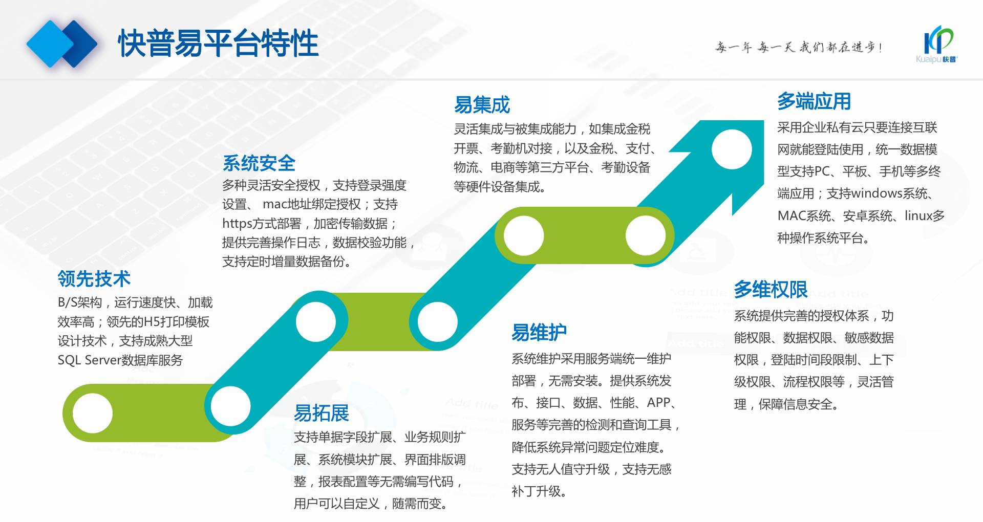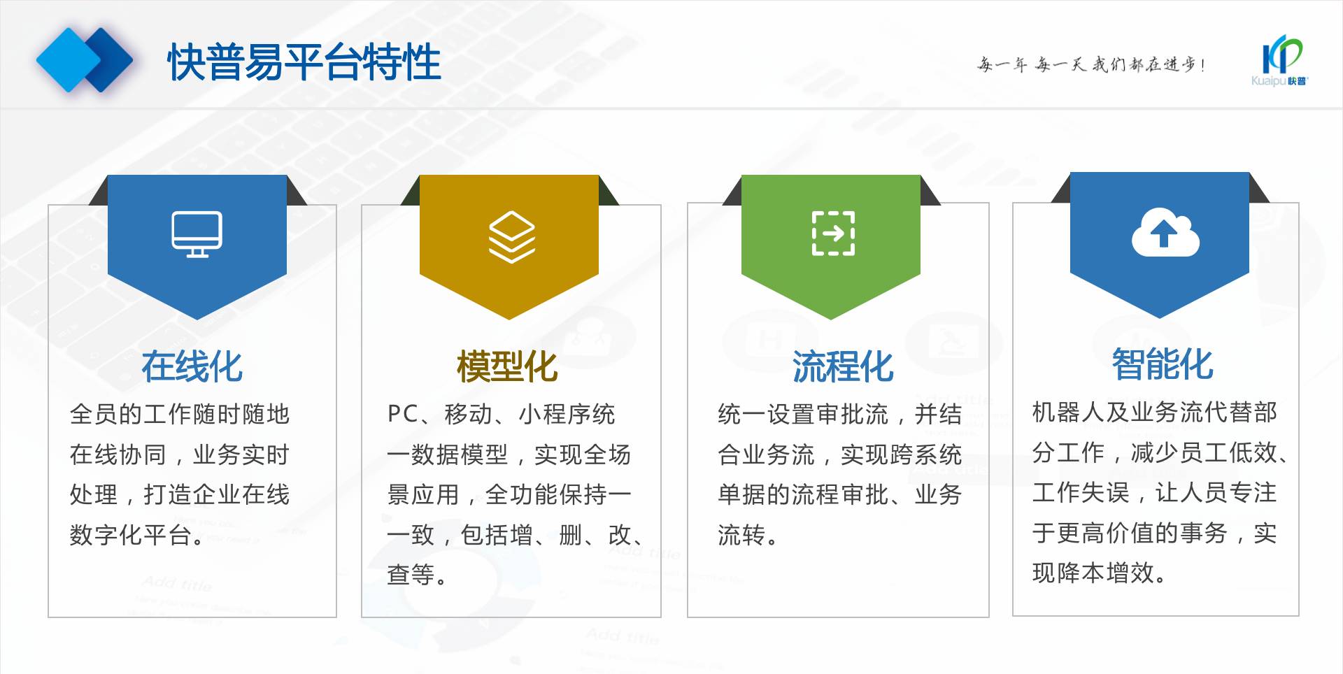 為了解決市場(chǎng)需求與平臺(tái)產(chǎn)品瓶頸等矛盾,實(shí)現(xiàn)徹底的零代碼平臺(tái),快普?qǐng)?jiān)持理念創(chuàng)新,以理念推動(dòng)平臺(tái)技術(shù)的創(chuàng)新?!耙圆蛔儜?yīng)萬(wàn)變”的理念:分析哪些東西未來(lái)肯定不變?哪些趨勢(shì)未來(lái)一定會(huì)變?從變化中找出不變的因素,從不變中找出變動(dòng)的因素;從量變到質(zhì)變,經(jīng)歷萬(wàn)變總結(jié)抽象出不變的本質(zhì)?;诳炱臻L(zhǎng)期的信息化服務(wù)經(jīng)驗(yàn),開(kāi)發(fā)配置出企業(yè)數(shù)字化轉(zhuǎn)型工具:快普易平臺(tái)成功解決了企業(yè)數(shù)字化轉(zhuǎn)型升級(jí)面臨的客戶(hù)大量個(gè)性化需求,真正實(shí)現(xiàn)隨需而變的設(shè)計(jì)理念,大大降低了信息化投入成本,提高信息化效率,幫助企業(yè)實(shí)現(xiàn)自主可控的技術(shù)創(chuàng)新,從而進(jìn)一步推動(dòng)企業(yè)的業(yè)務(wù)創(chuàng)新和管理創(chuàng)新。
