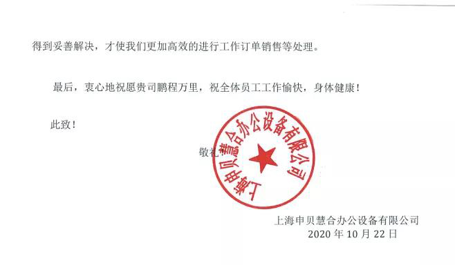 近日,上海申貝慧合辦公設(shè)備有限公司(以下簡稱“申貝慧合”)向我司發(fā)來感謝信。