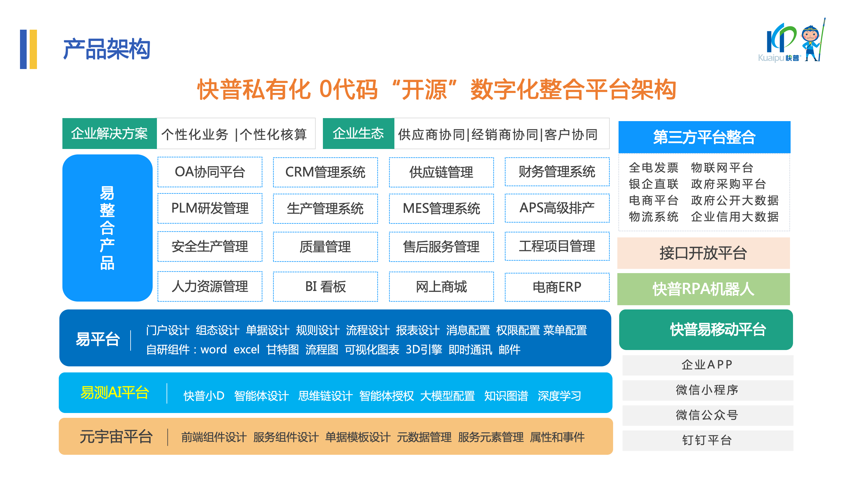 快普以“整合管理”為核心的數(shù)字化轉(zhuǎn)型理念,通過“一個平臺”覆蓋企業(yè)全鏈條管理,包括PLM研發(fā)管理、APS高級排產(chǎn)、MES車間執(zhí)行、供應鏈協(xié)同、集團化財務核算等。